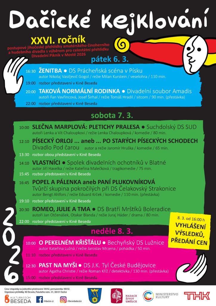 Abyste byli v obraze, připravili jsme opět Kejklovačky – festivalový zpravodaj, k kde najdete představení poroty, souborů i všech inscenací, které letos na 26. ročníku Dačického kejklování uvidíte.