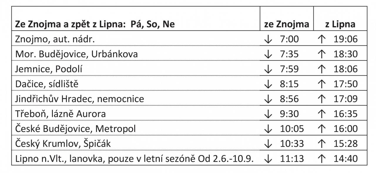 Od 2. 6. 2023 bude jezdit pravidelná linka Ze Znojma a zpět z Lipna. Linka bude jezdit pátky, soboty a neděle. Trasa povede před Dačice se zastávkou Dačice, sídliště.