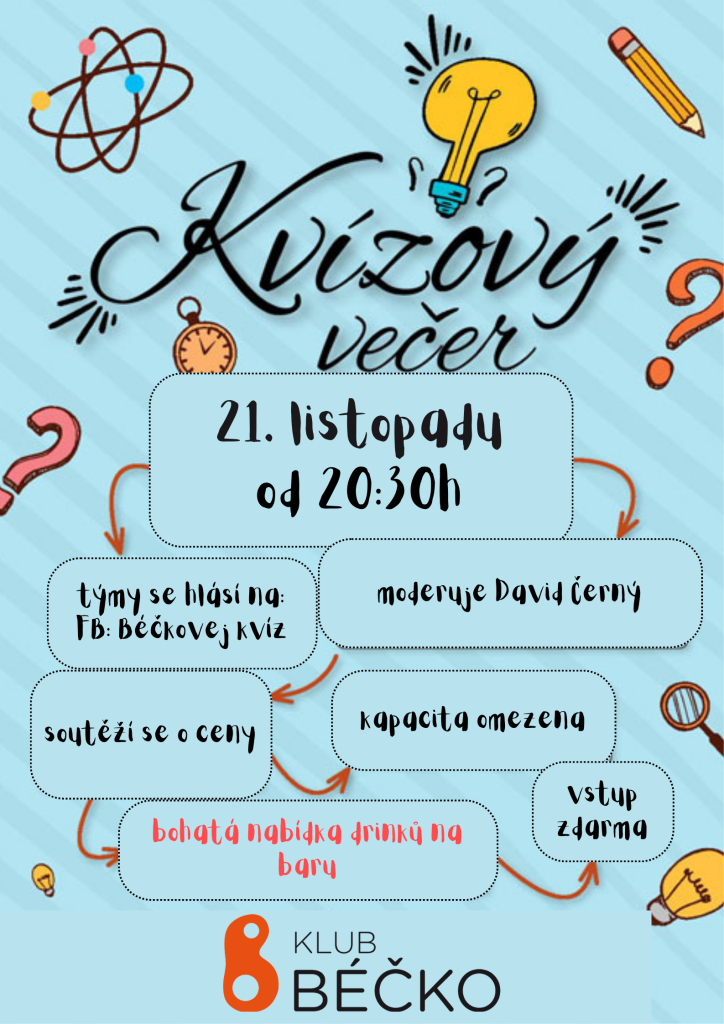 hospodský kvíz moderuje David Černý kvíz je všeobecný týmy se hlásí na Fb skupině: Béčkovej kvíz nebo SMS na tel.: 602 780 525 kapacita omezena