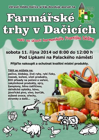 V sobotu 11. října se v Kancnýřově sadu na Palackého náměstí uskuteční Farmářské trhy. Těšit se můžete na sýry, pečivo, ryby, mošty, víno, burčák, bylinky, česnek a další. O hudební program se nám postará harmonikář František Dědina.