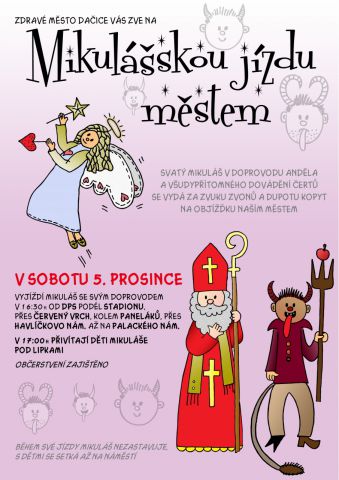 Zdravé město Dačice Vás zve na Mikulášskou jízdu městem, která se uskuteční v sobotu 5. prosince. Mikuláš se svým doprovodem vyjíždí v 16:30 h od DPS podél stadionu, přes Červený Vrch, kolem paneláků přes Havlíčkovo nám. až na Palackého nám. Děti se s Mikulášem přivítají v 17:00 h Pod Lipkami. Během své cesty Mikuláš nezastavuje, s dětmi se setká až na náměstí. Občerstvení zajištěno.