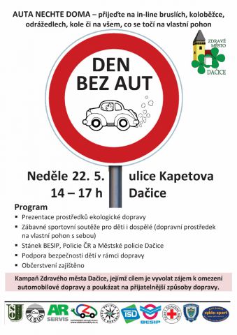 Zdravé město Dačice pořádá v neděli 22. května osvětovou kampaň Den bez aut. Akce se uskuteční od 14 do 17 hodin v ulici Kapetova v Dačicích. Cílem kampaně je vyvolat zájem k omezení automobilové dopravy a poukázat na přijatelnější způsoby dopravy. V rámci programu jsou pro děti připraveny zábavné sportovní soutěže a dospělí se mohou těšit na prezentaci prostředků ekologické dopravy. Nezapomeňte na to důležité – auta nechejte doma, na akci přijeďte na in-line bruslích, koloběžce, odrážedlech, kole či na všem, co se točí na vlastní pohon. Těšíme se na Vás!