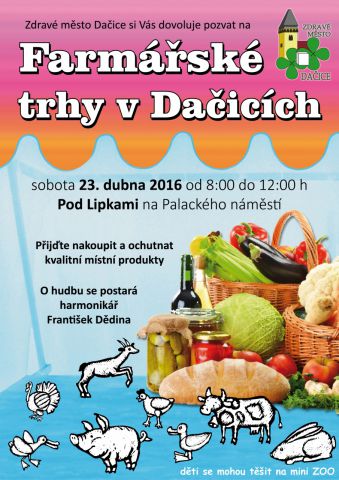 V sobotu 23. dubna se od 8:00 do 12:00 h uskuteční jarní farmářské trhy v Dačicích. Farmářské trhy se konají již čtvrtým rokem a za tuto dobu se staly již tradiční akcí v Dačicích, která si našla svoji oblibu jak u prodejců, tak návštěvníků akce. O hudební zpestření se již tradičně postará harmonikář František Dědina a nejen děti se mohou těšit na mini ZOO. Seznam prodejců najdete uvnitř.