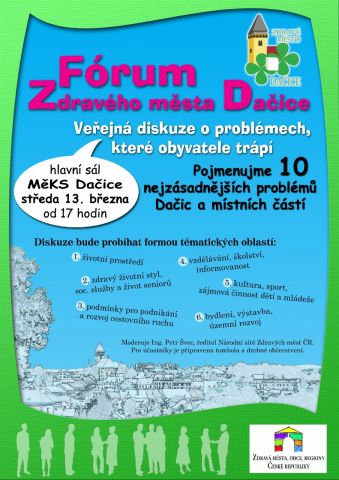 Ve středu 13. března pořádá město Dačice veřejné projednání k celkovému rozvoji města s názvem Fórum Zdravého města Dačice. Hlavním výstupem fóra bude pojmenování deseti nejzásadnějších problémů města Dačice a jeho místních částí z pohledu obyvatel. První ročník fóra bude zahájen v 17:00 h v hlavním sále MěKS Dačice a je velkou příležitostí pro Vás, občany našeho města, zástupce spolků, zájmových organizací a podnikatelů, kteří máte náměty a nápady, jak ovlivnit příští rozvoj našeho města.