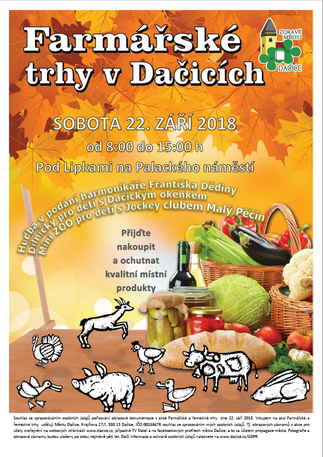 V sobotu 22. září se od 8:00 do 15:00 h uskutečnily podzimní farmářské trhy v Dačicích. Farmářské trhy se konají již šestým rokem a za tuto dobu se staly již tradiční akcí v Dačicích, která si našla svoji oblibu jak u prodejců, tak návštěvníků akce. O hudební zpestření se již tradičně postaral harmonikář František Dědina. Děti byly nadšeny z mini ZOO a dílniček s Dačickým okénkem. Seznam prodejců najdete uvnitř.