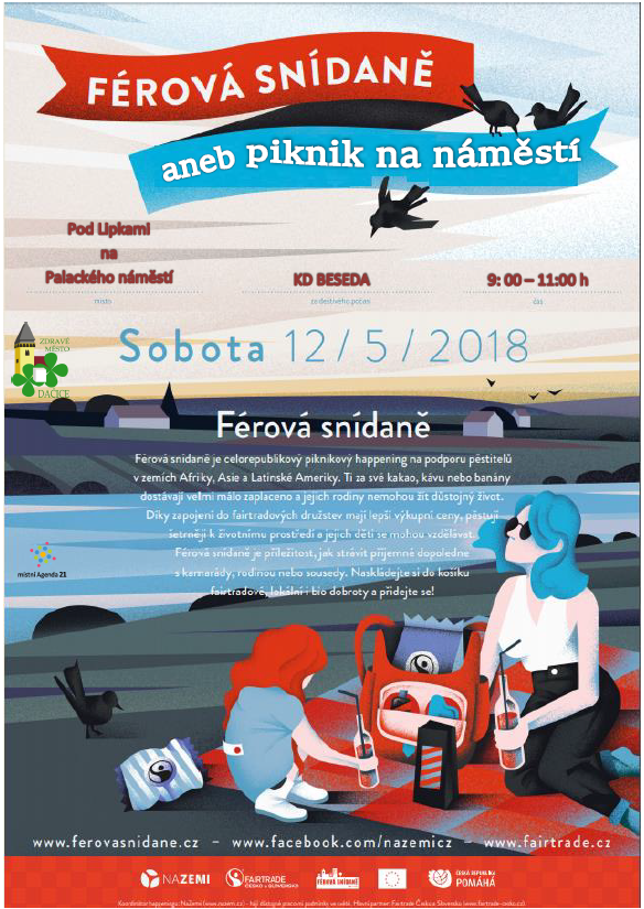 V sobotu 12. května se od 9:00 do 11:00 h uskuteční první ročník "Férové snídaně" v Dačicích k podpoře pěstitelů v zemích Afriky, Asie a Latinské Ameriky. Férová snídaně je příležitost, jak strávit příjemné dopoledne Pod Lipkami s kamarády, rodinou nebo sousedy. Naskládejte si do košíku lokální, bio či fairtradové dobroty a přidejte se!