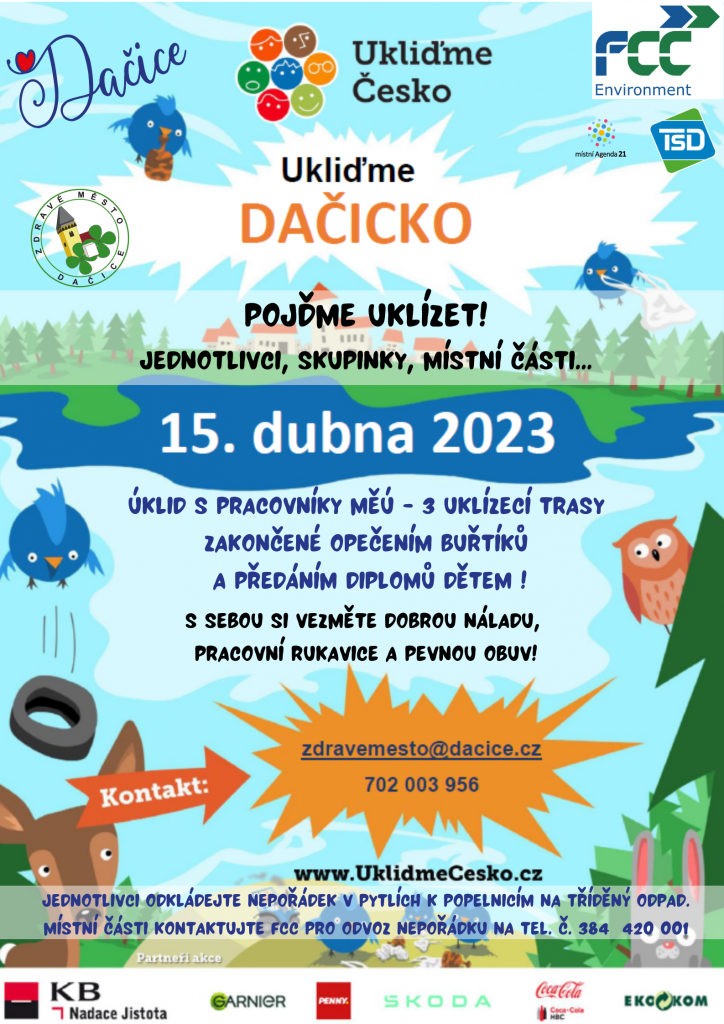 Jejím cílem je zbavit česká města, vesnice a přírodu volně odhozeného nepořádku a černých skládek. I přesto, že město věnuje nemalé prostředky na průběžný úklid Dačic a místních částí, můžeme po cestě do práce nebo při procházkách v našem krásném městě či přírodě narazit na místa a zapadlé kouty, kde se nachází pohozené odpadky či přímo úmyslně založené černé skládky. S nástupem jara je nejvhodnější čas s tím něco udělat!