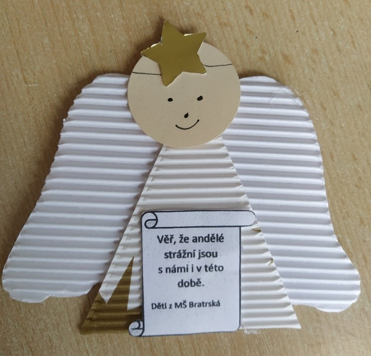 Dostali jsme tedy nápad lidem připomenout, že andělé strážní jsou stále s námi. Společnými silami vzniklo skoro 400 andělů vyrobených z okrasných papírů. Ty jsme s dětmi roznesli po okolí naší školky a rozdávali kolemjdoucím lidem. Rozdali jsme tak kromě andělů plno radosti a dodali jsme snad tak i odvahu bojovat s touto dobou dál.