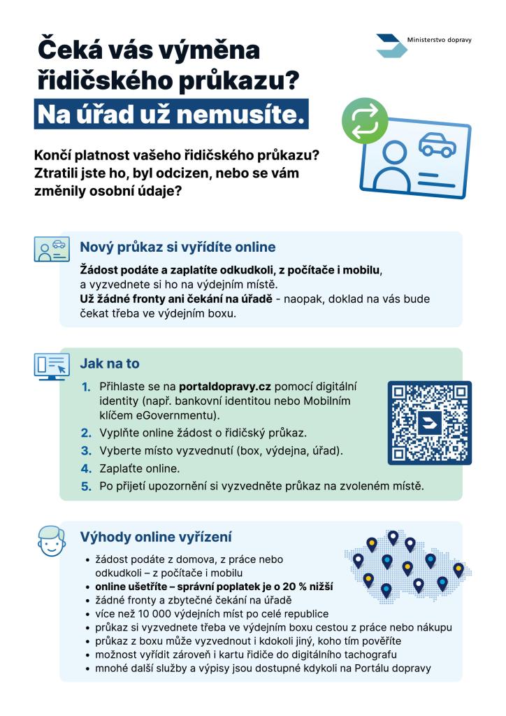 Nový řidičský průkaz si vyřídíte online. Požádat si o něj můžete prostřednictvím portaldopravy.cz a můžete si ho nechat zaslat do výdejního boxu. Už žádné fronty ani zbytečné čekání na úřadě.