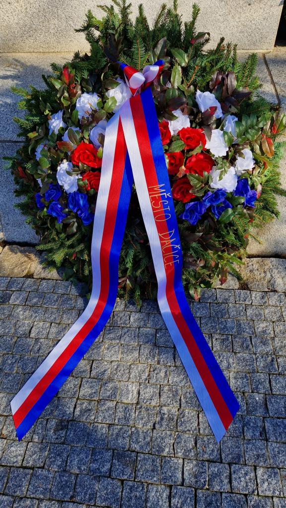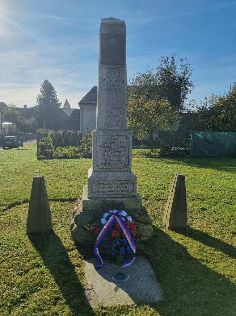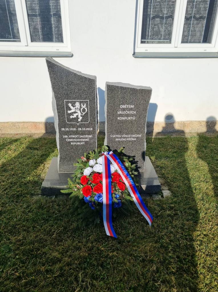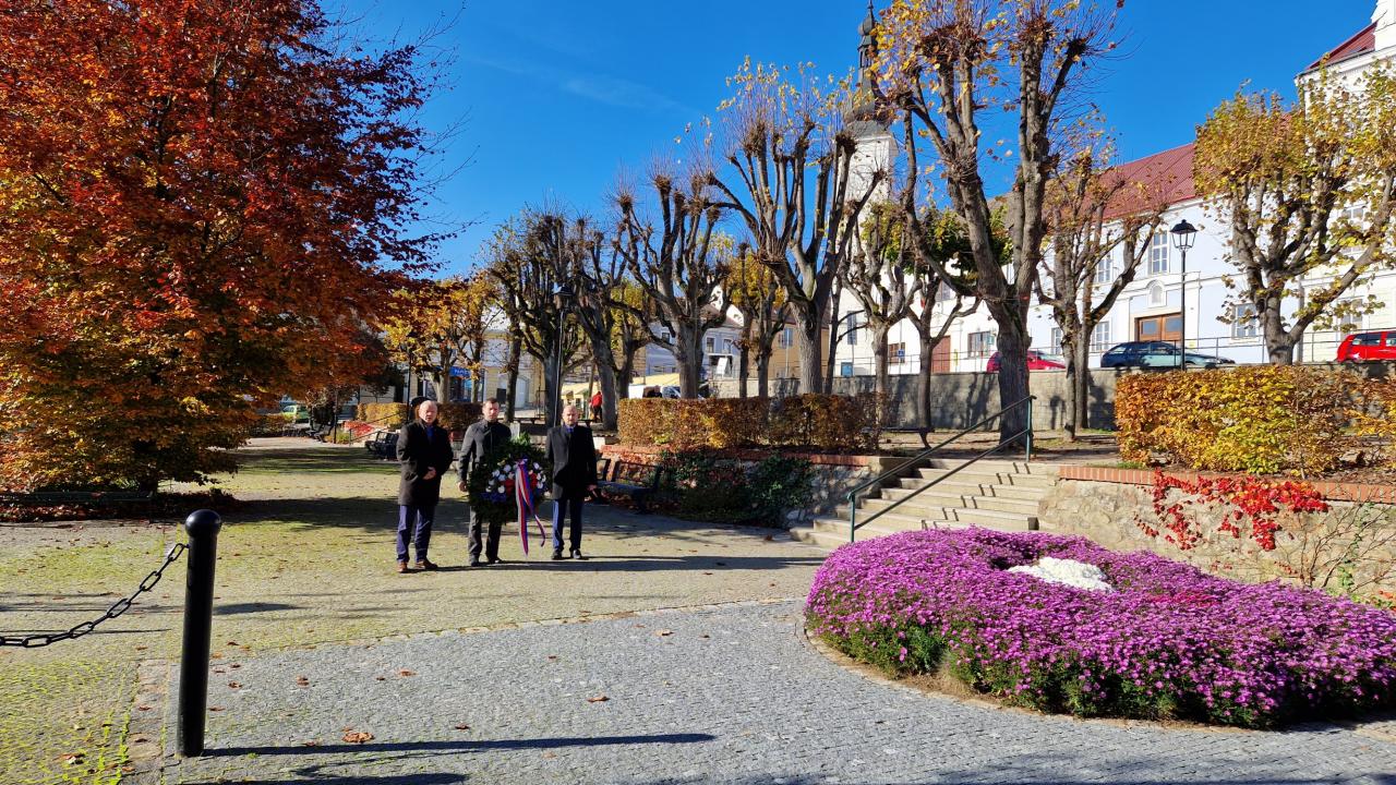 Starosta Miloš Novák, místostarosta Jiří Baštář a tajemník městského úřadu Zdislav Páral uctili 104. výročí vzniku samostatného československého státu položením věnce k pomníku obětem světových válek v Kancnýřově sadu.