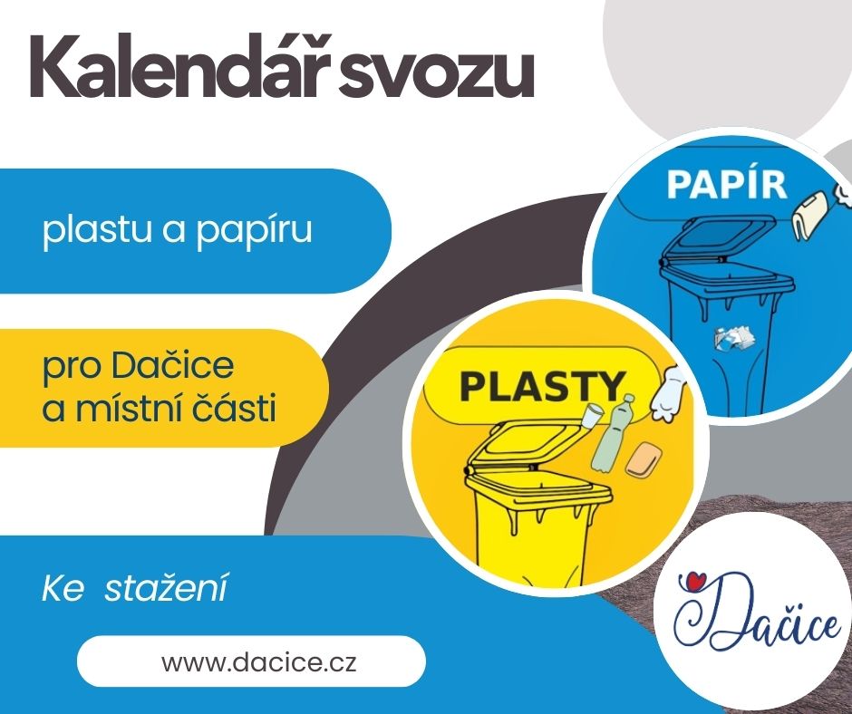Kalendář svozu papíru a plastu v Dačicích a místních částech v roce 2025 ke stažení níže nebo k vyzvednutí na Infocentru Dačice.