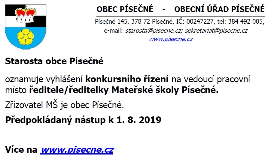Obec Písečné oznamuje vyhlášení konkursního řízení na vedoucí pracovní místo ředitele/ředitelky Mateřské školy Písečné. Více na www.pisecne.cz.