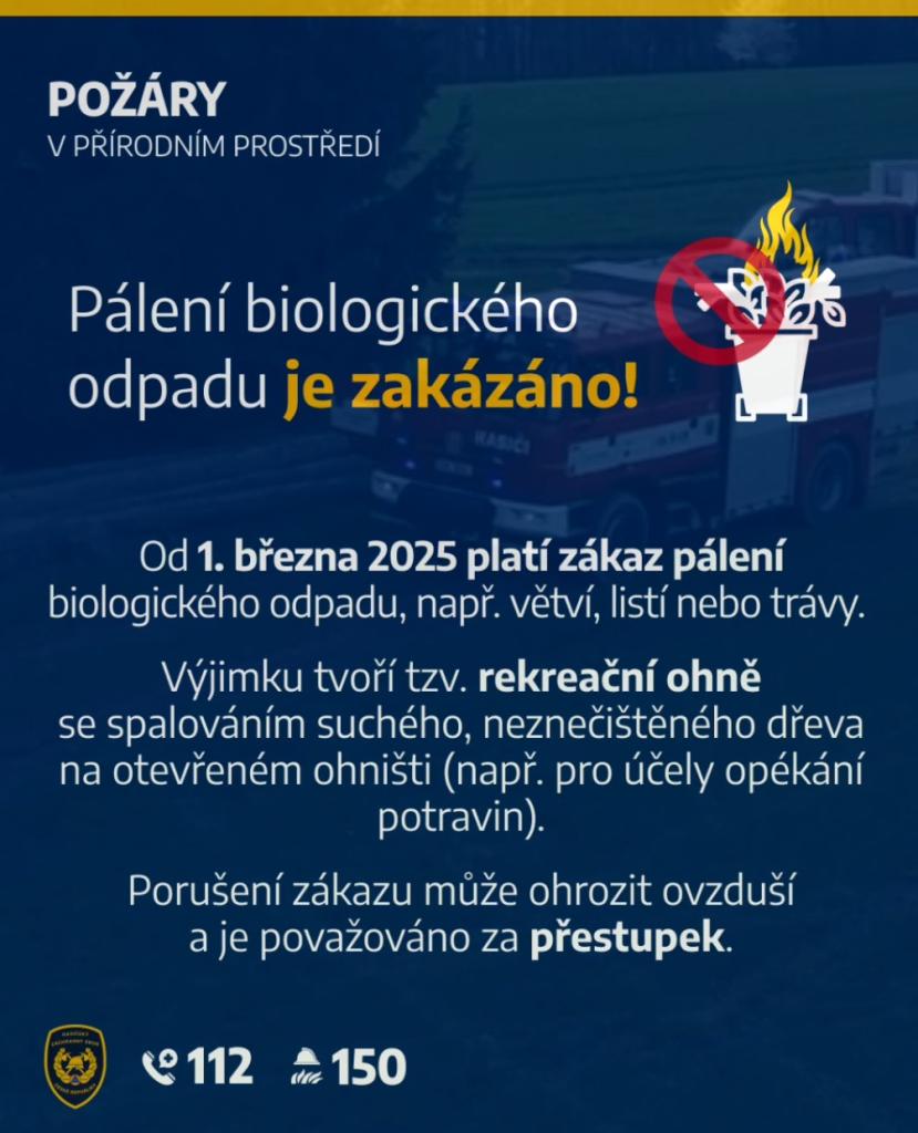 1. března 2025 vstoupila v platnost novela zákona č. 201/2012 Sb., o ochraně ovzduší, která zakazuje pálení trávy, listí a další biomasy na otevřeném ohni za účelem jejich likvidace. Tento zákaz platí na celém území České republiky a za porušení hrozí pokuty.