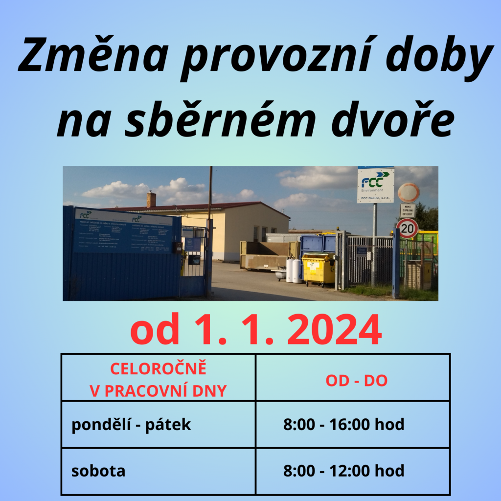 Z důvodu větší přehlednosti bude sjednocena celoročně provozní doba ve sběrném dvoře od 1.1.2024, a to v pracovní dny od 8:00 do 16:00 h a v sobotu, pokud nebude státní svátek, od 8:00 do 12:00 h.